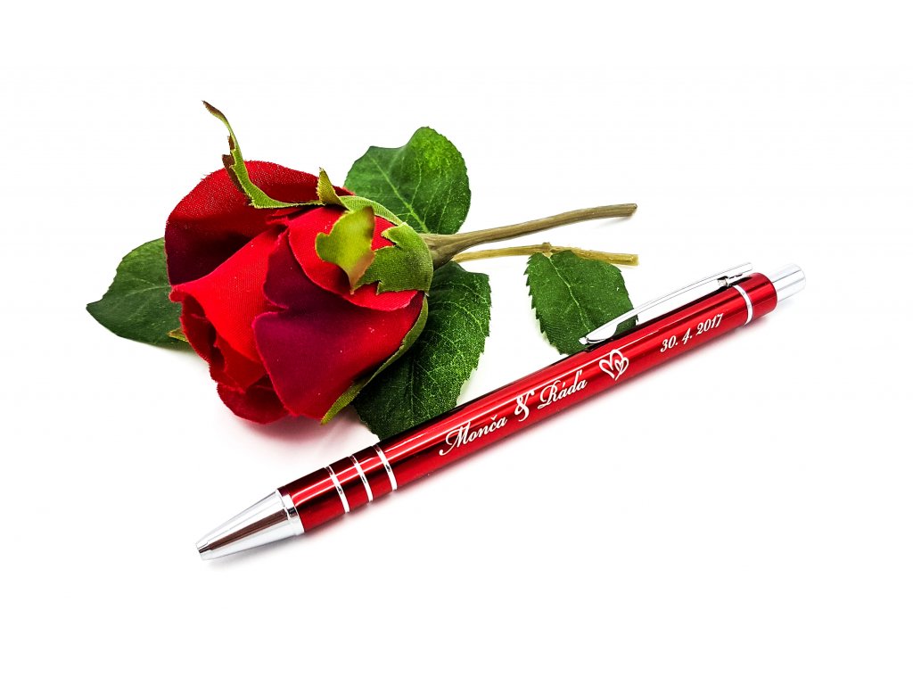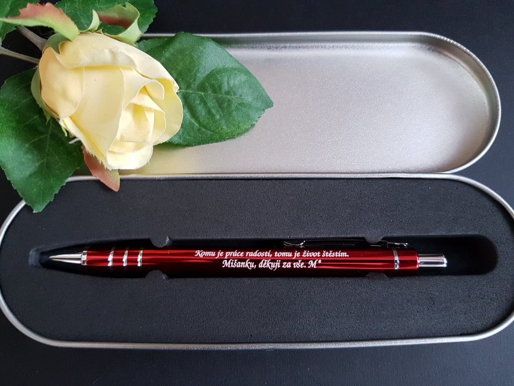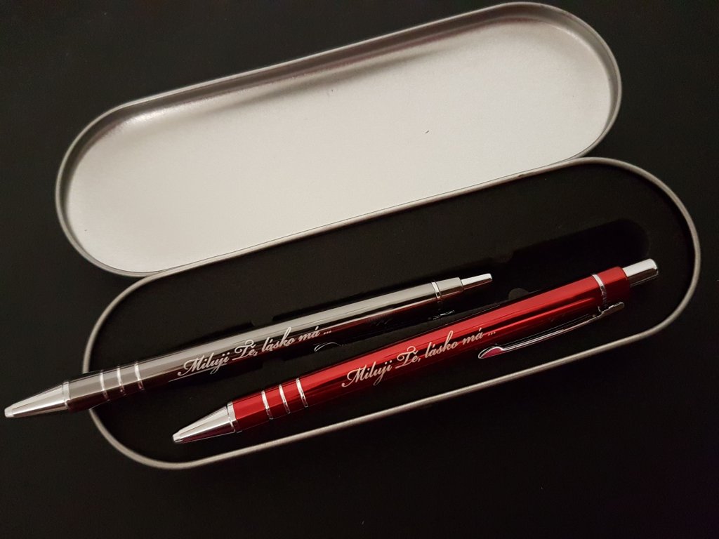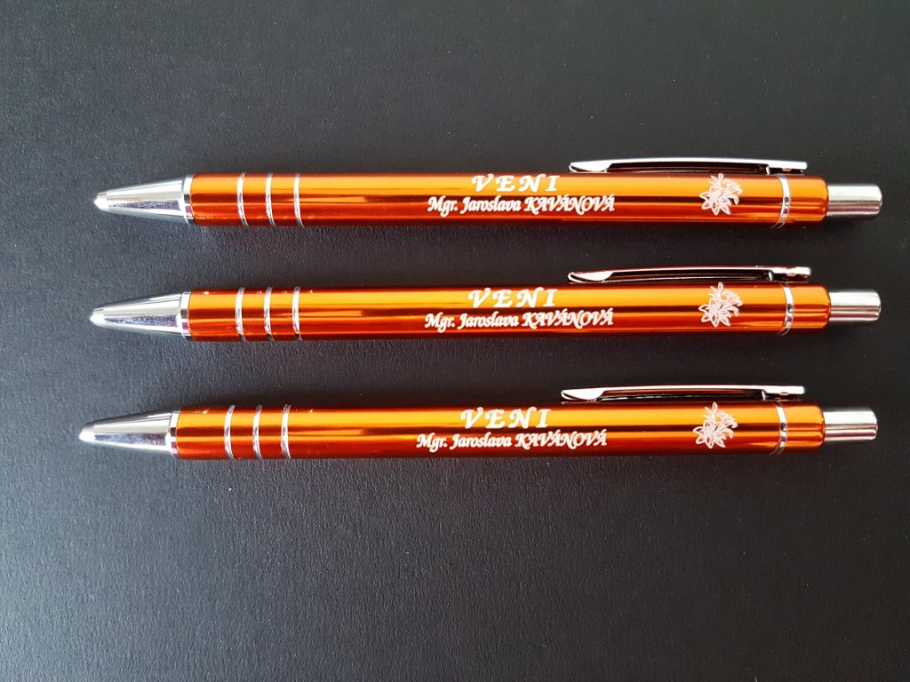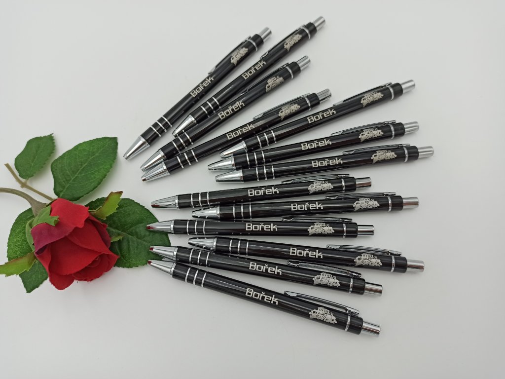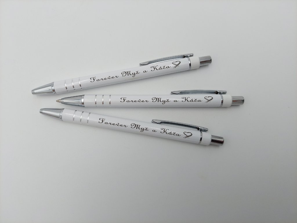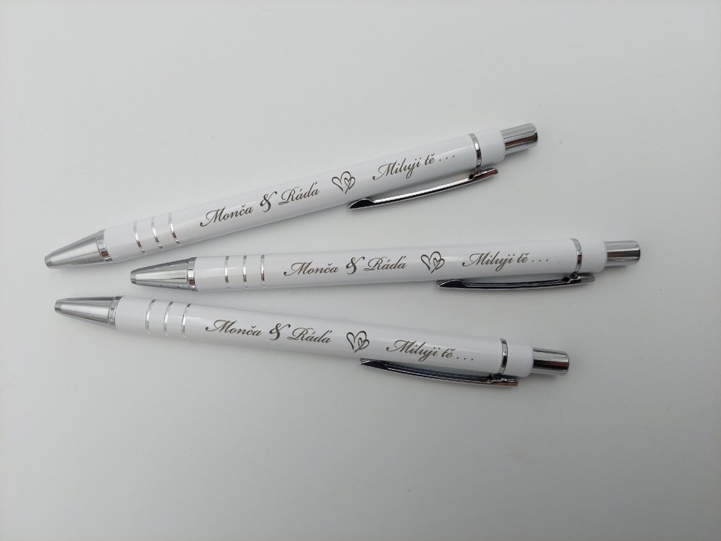 Po odgravírování dané barvy propisky, je text a obrázek vždy stříbrný. Naše firma Vám propisku vygravíruje tak, aby po položení na stůl nebyl text ujetý a byl velmi dobře čitelný pro zákazníka, aniž by jste museli propisku natáčet. Velmi si to chválí podnikatelé, kdy jejich reklama je pěkně viditelná, nebo nevěsty, které svým hostům položí propisku na svatební stůl a okamžitě jsou jejich jména vidět. Často si je nechávají snoubenci u nás vyrobit, nejenom jako jmenovky na svatební stůl, ale hlavně na památku na první novomanželský podpis v barvě svatby. Jsou velmi vhodné pro náročné klienty, propisky netečou a jejich náplně se dají zakoupit kdekoli v ČR.